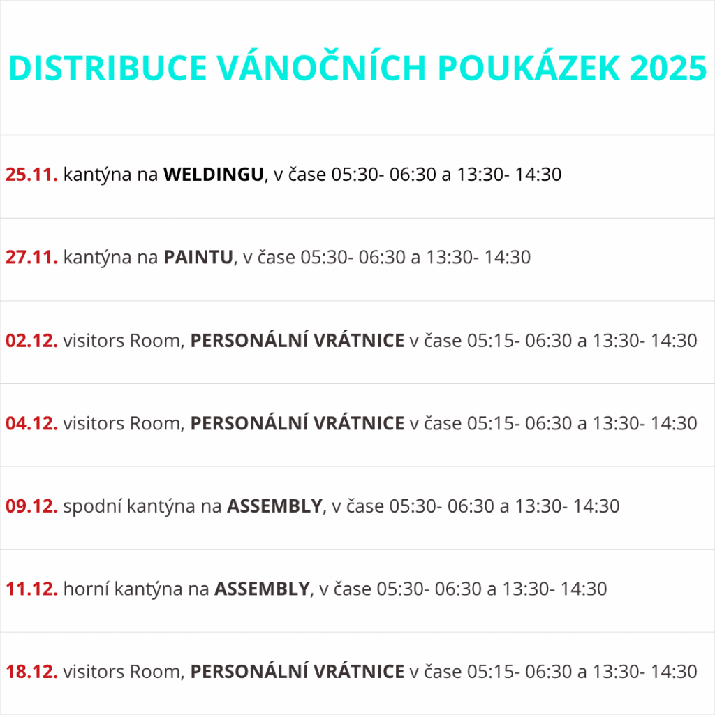 01/12/2025 Pro letošní rok by mělo jít o odstávky již poslední.. A to tentokráte v pondělí 08.12. pro všechny tři směny, a nakonec neproběhne ani předsunutá noční směna v neděli dne 14.12.2025.