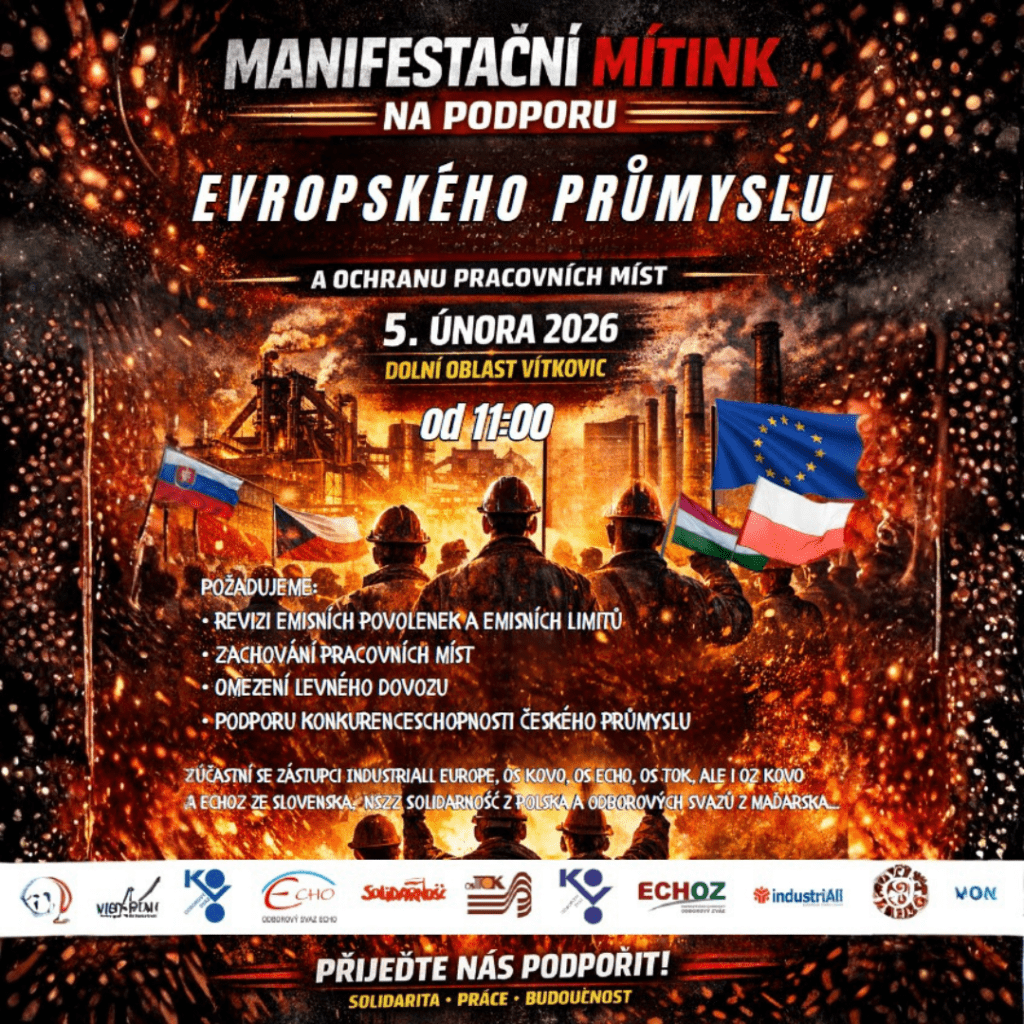 19/01/2026 Ve čtvrtek 5. února se bude v Dolní oblasti Vítkovic konat, v rámci Akčního dne pořádaného IndustriAll Europe, manifestační mítink na podporu evropského průmyslu proti opatřením EU. Mítink začíná v 11 hodin a zúčastní se ho také kolegové z Polska, Slovenska, Maďarska, Německa.